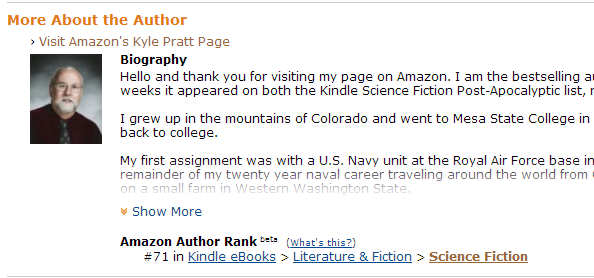 That would be nice enough, but the spike in sales has moved me into the top 100 rank of Kindle science fiction authors on Amazon.com. I’ve been watching my ranking climb for the last 24 hours. As I write this early Saturday morning I’m ranked #71. That places me ahead of both Larry Niven, who wrote Lucifer's Hammer, Margaret Atwood, author of The Handmaiden's Tale and Michael Crichton who penned The Lost World, or as most people know it, Jurassic Park.
