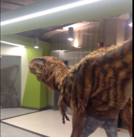 My wife sent me this video. The YouTube description states it occurred last year at the headquarters of Groupon in Chicago. That description also says that this is a baby tyrannosaurus, but I think it is supposed to be a velociraptor traipsing around the lobby of the building.