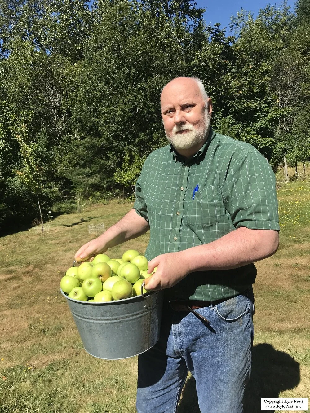 We tasted some of the fruit (the ones still on the tree, not from the ground). They were sweet. So, we started harvesting. This is a picture of me with the first of four tubs of just Chehalis Apples. We also have Honey Crisp, Liberty, Gala, Granny Smith, and Yellow Delicious that are not yet ready for harvest.