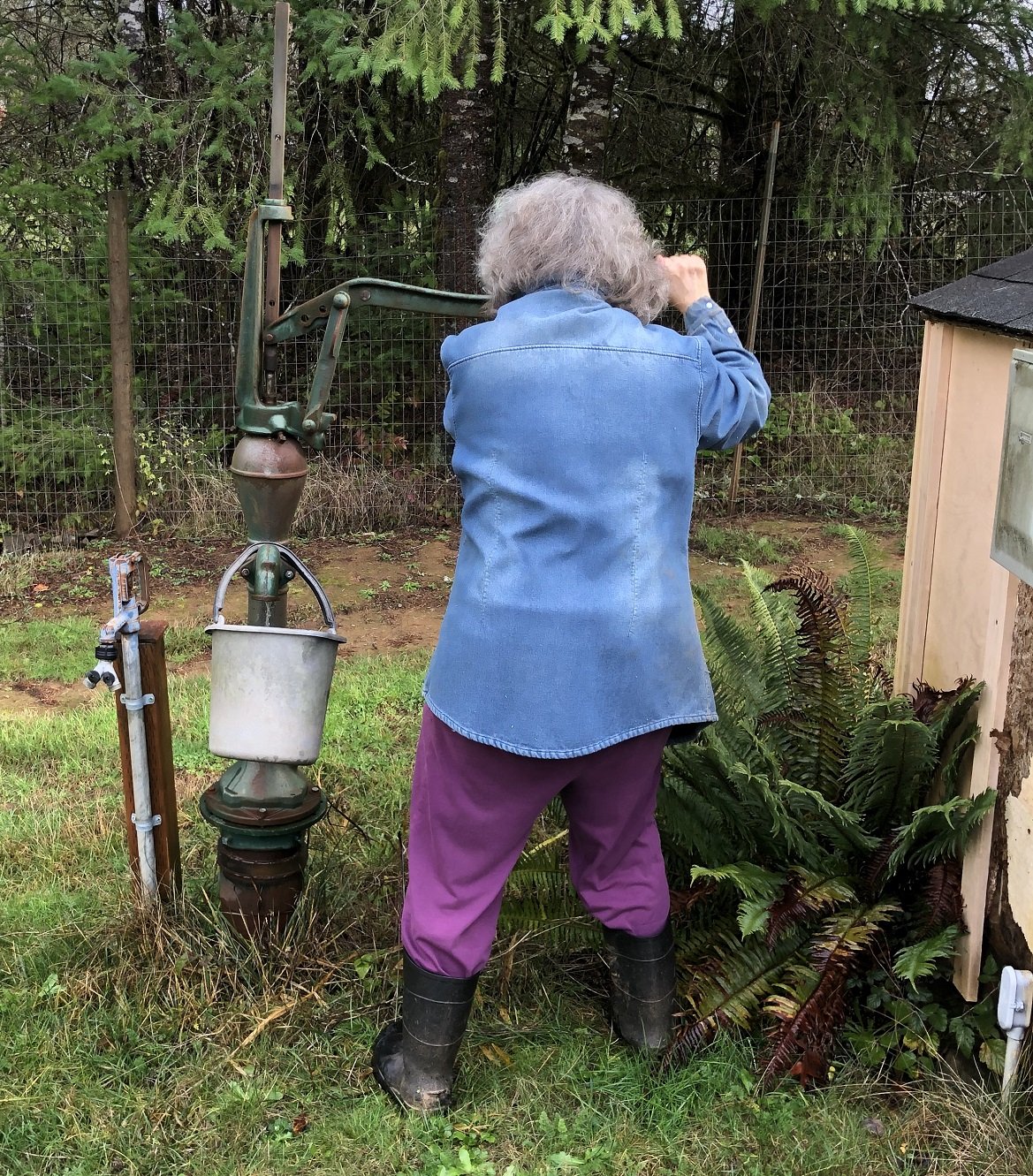 My wife pumping at the well. Yes, I did help pump.