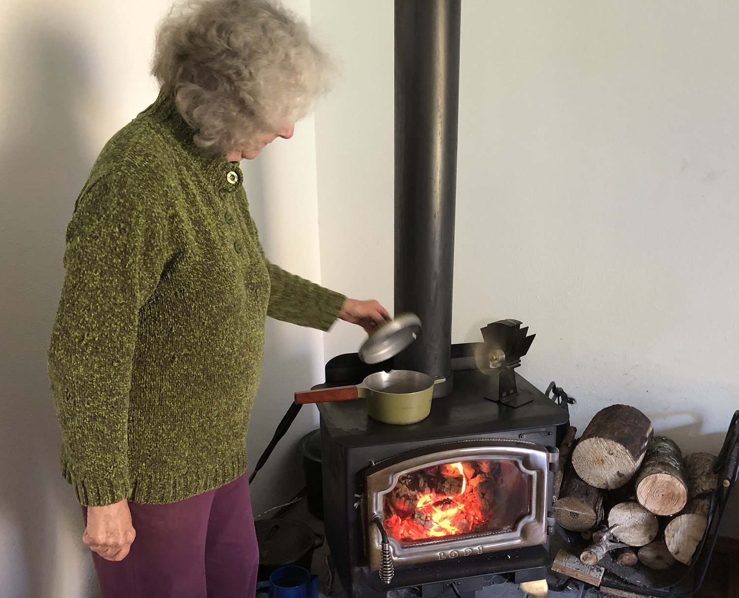My wife cooking on our woodstove