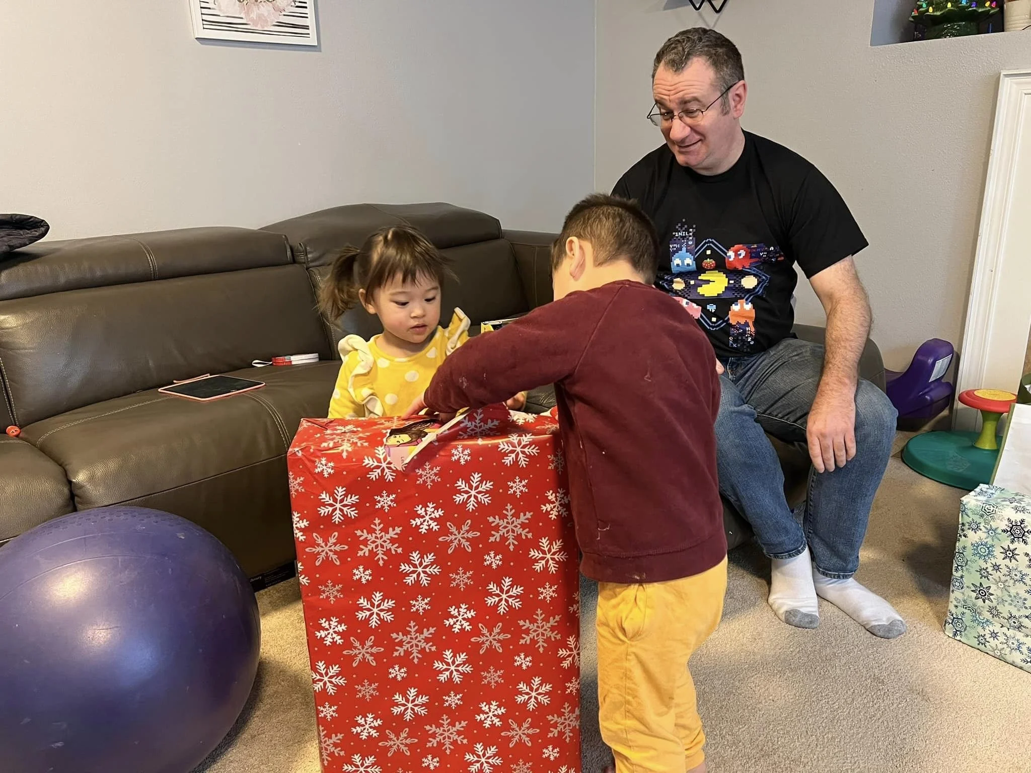 Emile and Oliver open a Christmas present from Uncle James. Christmas 2022