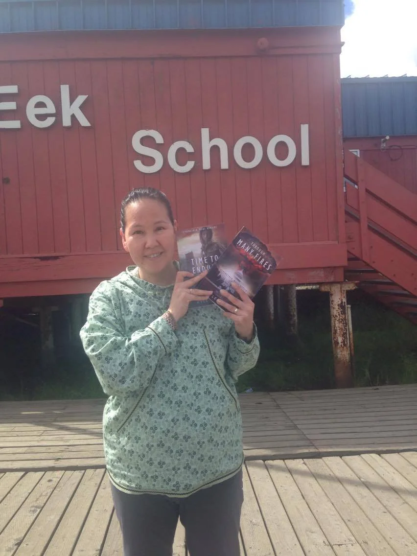 Loni from Eek, Alaska, in front of the village school with Through Many Fires and A Time to Endure.