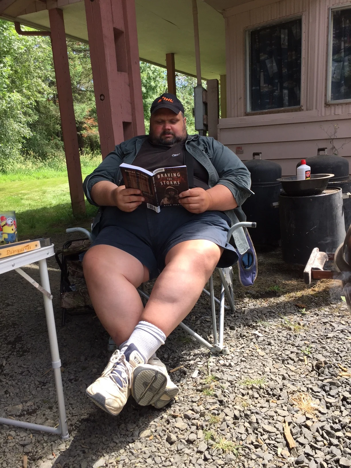 Chris in Napavine, Washington State, reads Braving the Storms while the barbecue warms up.