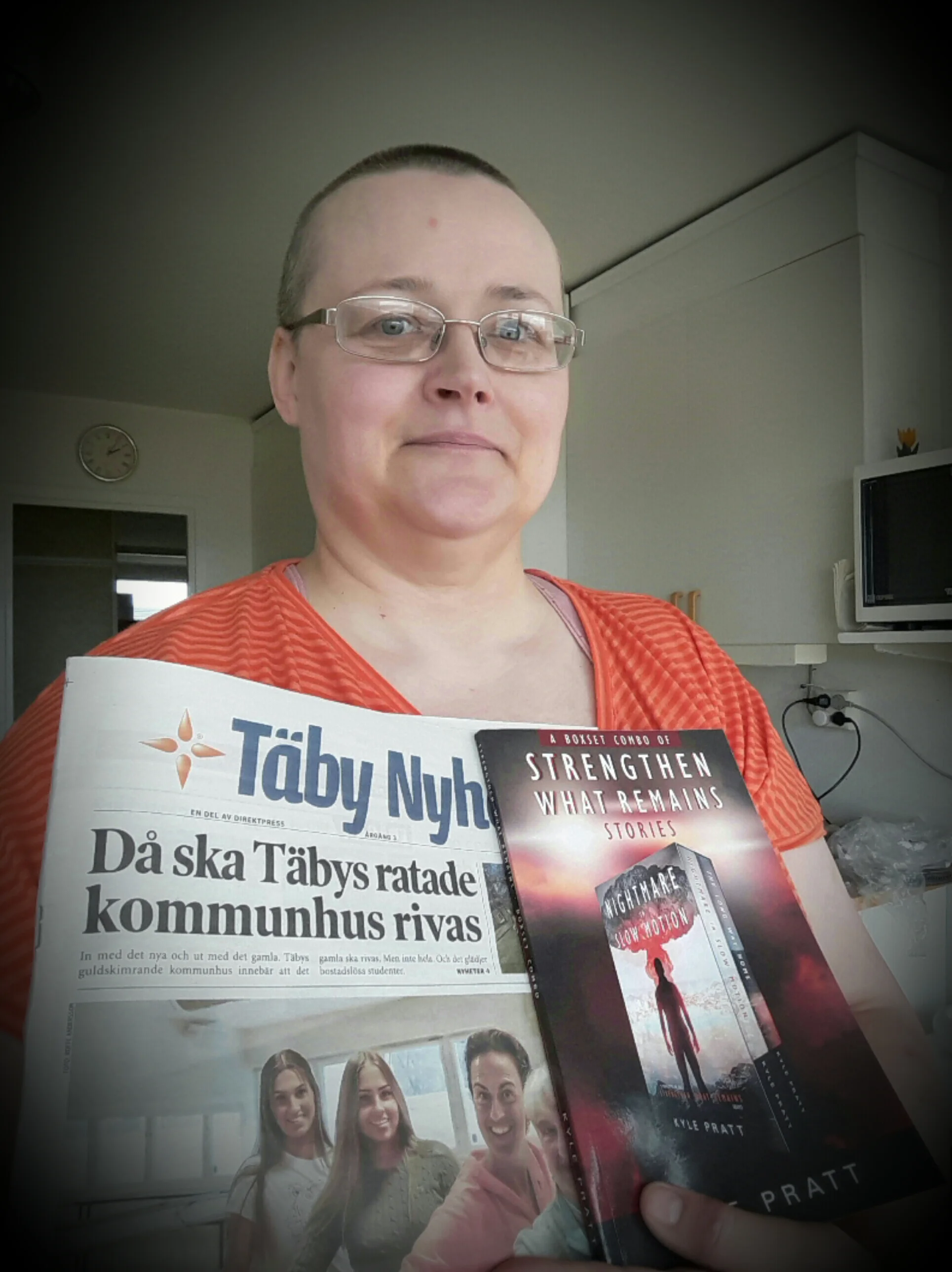 Karina from Sweden holds a copy of the combo book with Nightmare in Slow Motion and The Long Way Home.